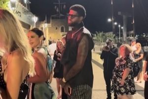 照片中乔治在夜店门口排队,等待入场,值得一提的是,他还戴着护膝。