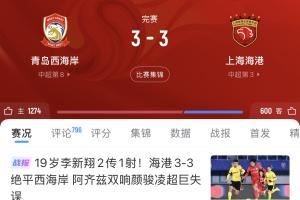 体育资讯07月26日讯 中超第18轮,青岛西海岸客场2-2逼平上海海港,邵佳一带队本赛季两度战平海港(首回合主场3-3海港)。另外,本周中足协杯青岛西海岸120分钟2-2战平北京国安,点球遗憾告负。